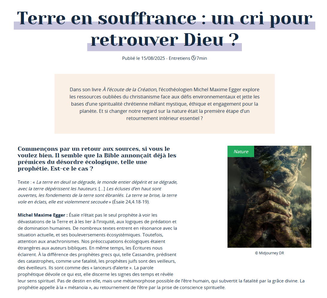 Dans son livre À l’écoute de la Création, l’écothéologien Michel Maxime Egger explore les ressources oubliées du christianisme face aux défis environnementaux et jette les bases d’une spiritualité chrétienne mêlant mystique, éthique et engagement pour la planète. Et si changer notre regard sur la nature était la première étape d’un retournement intérieur essentiel? (Entretien dans le magazine Inexploré, 15 août 2025.)
