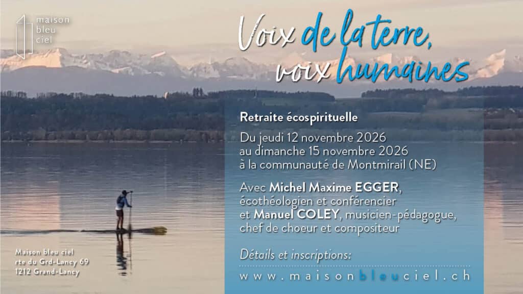 Entre chant et silence, danse et travail corporel, pratiques inspirées du «Travail qui relie» de Joanna Macy, éclairages et temps personnels au milieu des arbres, cette retraite d’écospiritualité propose un voyage intérieur, personnel et communautaire, pour nous mettre à l’écoute du Vivant et des Écritures. Un chemin de transformation pour changer notre regard sur la Création, en découvrir la profondeur divine, nous émerveiller de ses beautés, dire merci pour ses dons, participer à sa vie tissée d’interrelations, partager ses souffrances et son espérance.