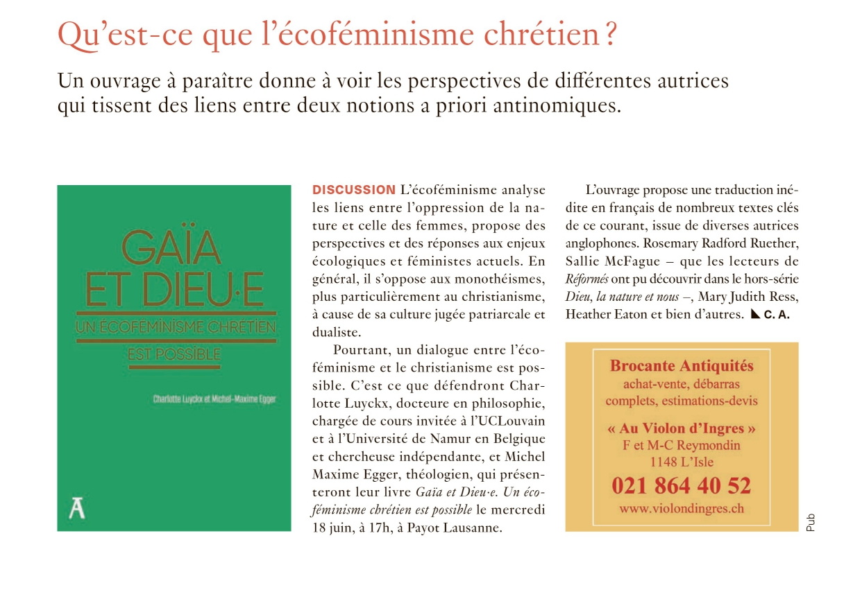 Animée par l'écojournaliste Christine Kristof, une rencontre sur le thème «Ecoféminisme: une chance ou un risque pour le christianisme?», avec le théologien catholique Fabien Revol, l’essayiste Audrey Fella, Charlotte Luyckx et moi-même.