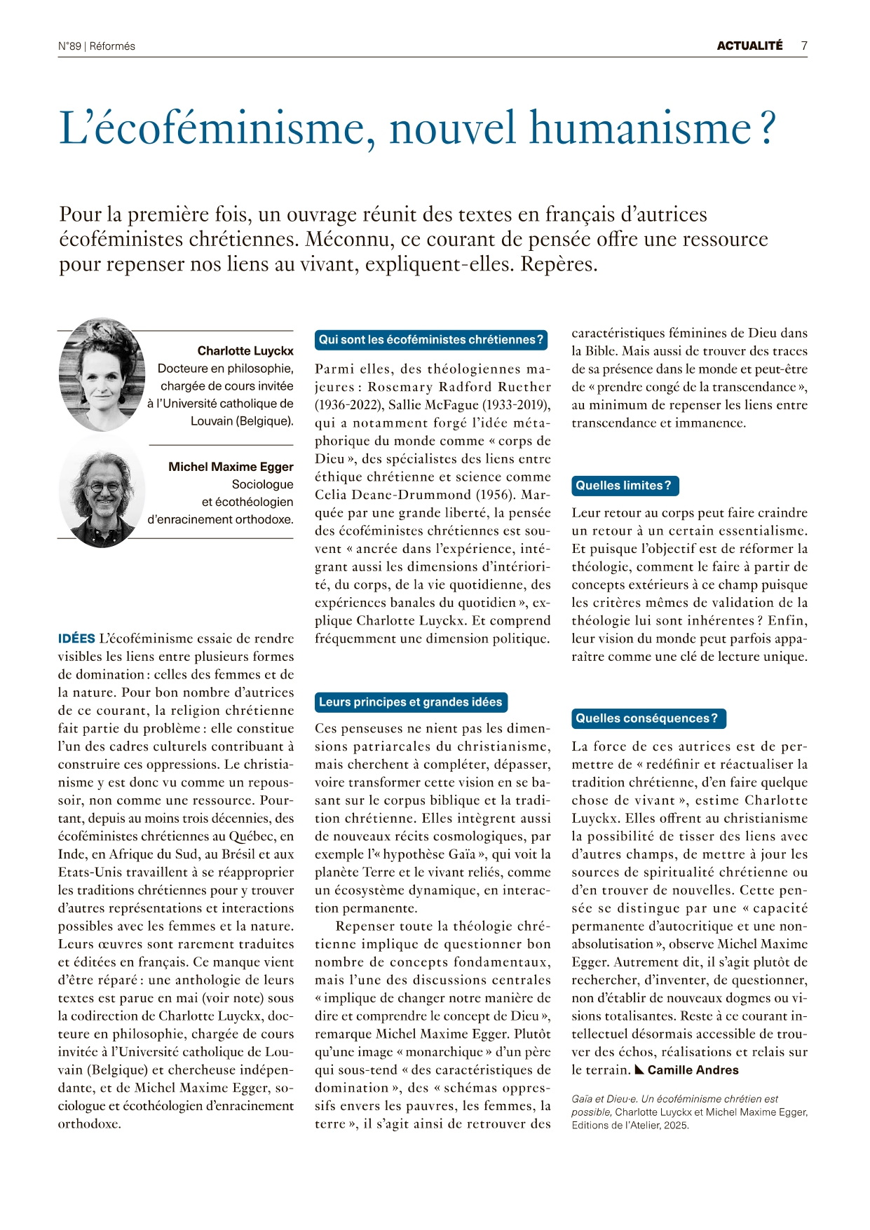 Est-il possible de réinventer la tradition chrétienne à l’ère de l’urgence écologique et des combats féministes? Dans le cadre de l'émission , au micro de Carole Pirker, Charlotte Luyckx montre comment des théologiennes écoféministes explorent cette question. L’enjeu, qui est au cœur de l’ouvrage Gaïa et Dieu.e (Editions de l’Atelier), consiste à réformer la tradition en déconstruisant notamment le modèle d’un Dieu patriarcal et anti-écologique. Babel (RTS), 15 juin 2025. Retranscription condensée de l'interview.